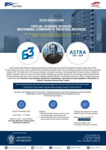Astra International Tbk akan mengadakan sharing pengetahuan secara virtual kepada mahasiswa Akuntansi Universitas Diponegoro pada 5 November 2020. Astra International Tbk. akan memberikan wawasan kepada