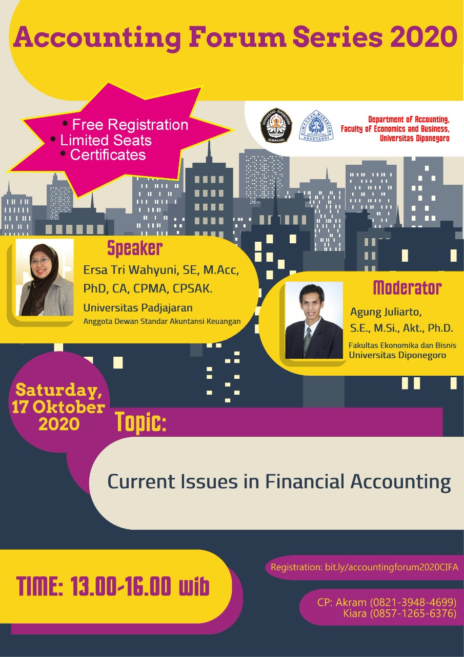 Department of Accounting Diponegoro University held an Accounting Forum (AF) serie on 17 October 2020. As with previous series this event was held virtually considering pandemic times. Current issues in financial accounting was chosed as topic of discussion. This topic presented by Ersa Tri Wahyuni, Ph.D of Padjajaran University, member of Indonesia Financial Accounting standard Board (DSAK-IAI) and moderated by Agung Juliarto, Ph.D of Diponegoro University. The discussion began with the impact of Covid-19 pandemic on financial reporting. She said that the major impact of pandemic on financial reporting is assets impairment. Amongst the response of this situation were guidelines for the company in application of PSAK 8, 68, and 71 as well as amendment of PSAK 73 issued by DSAK-IAI. Indonesia Government and Financial Service Authority (OJK) also released regulations and guideline to address this issue. In addition to pandemic issues, recent Indonesian Financial Accounting Standards update as well as future accounting standards development were interactively discussed. She also opened up insights regarding impact of Covid-19 pandemic on financial accounting and reporting as possibly interested research topics. This event was successfully attracted more than 500 participant coming from academics, practitioners, students and general public.